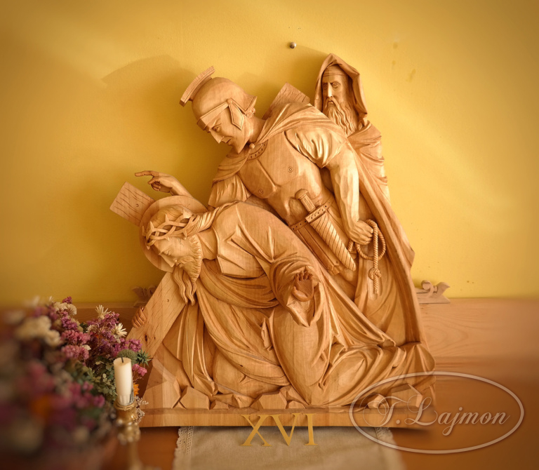 V mozaike zastavení krížovej cesty má pre Tomáša Lajmona osobitné miesto výjav, ktorý dodnes vháňa slzy do očí mnohým veriacim – moment, kedy svätá Veronika podáva Ježišovi šatku. V tomto nenápadnom geste rezbár nevidí len historickú udalosť, ale predovšetkým prejav hlbokej vnútornej sily a mimoriadnej vnímavosti. Veronika v jeho podaní zosobňuje tichú, no neoblomnú prítomnosť tých, ktorí dokážu Kristovo utrpenie vnímať citlivejšie než dav okolo nich. „Je to o hĺbke viery, ktorá je rýdza a úprimná,“ zamýšľa sa umelec. Postava Veroniky nám tak aj po stáročiach pripomína, že tichá pomoc a pochopenie majú v očiach Boha nevyčísliteľnú hodnotu.